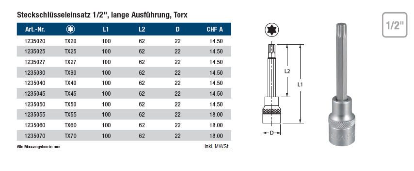 TX-Einsatz STARCH 1/2", lange Ausführung, Chrom-Vanadium-Stahl matt satiniert TX30x100 1/2"