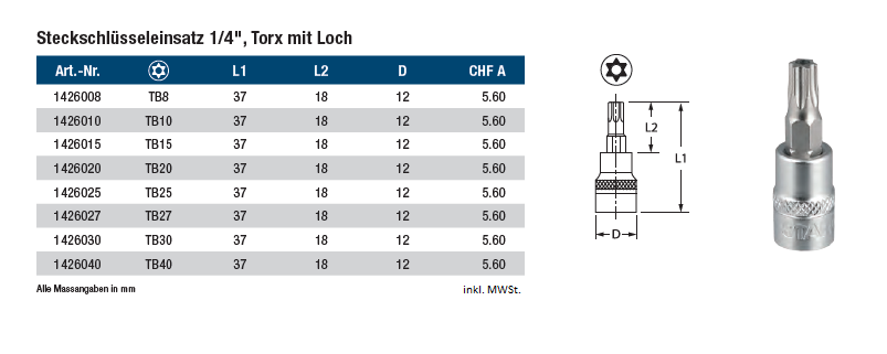 TX mit Bohrung-Einsatz STARCH 1/4", Chrom-Vanadium-Stahl matt satiniert TB15x37mm 1/4"