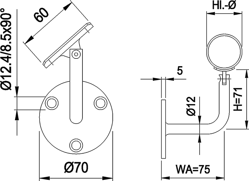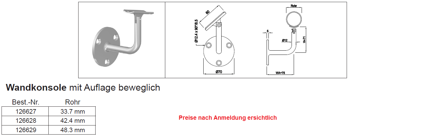 Wandkonsole beweglich mit Auflager + runder WP, Guss CNS 1.4301 42,4-12