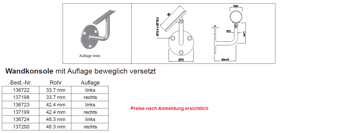 Wandkonsole beweglich mit Auflager versetzt links, Guss CNS 1.4301 48,3-12