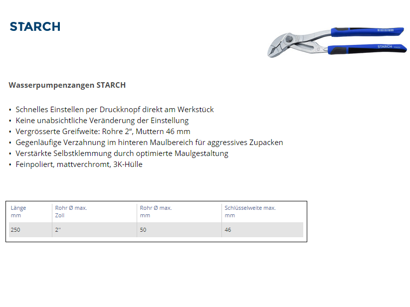 Wasserpumpenzange STARCH, mattverchromt feinpoliert 250mm